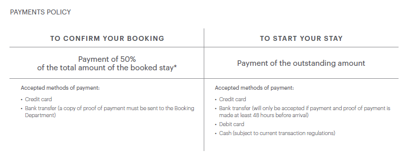 If you choose to pay by bank transfer, you will be required to notify the Booking Department in advance and make the transfer in a timely way, sending the corresponding proof of payment at least 48 hours before arrival, since the payment must be received in full before check-in.