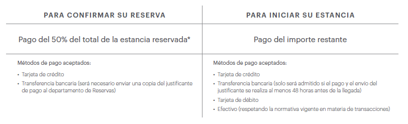 Para confirmar la reserva se requiere el pago del 50% del total de los servicios reservados, en concepto de depósito. En caso de que el alojamiento reservado sea en Royal Suite, el importe requerido para la confirmación será del 100%.